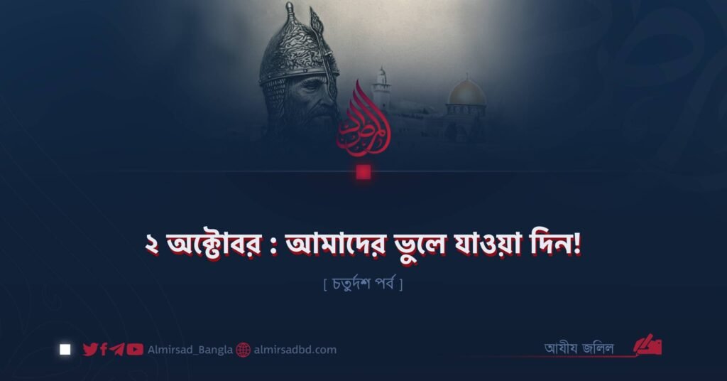 ইতিহাসে এমন কিছু দিন আছে, যা কেবল মুসলিমদের জন্যই নয়, বরং সমগ্র মানবজাতির জন্যও গৌরবের প্রতীক। সেই উজ্জ্বল দিনগুলোর একটি হলো ১১৮৭ সালের ২ অক্টোবর, যেদিন সালাহুদ্দীন আইয়ুবী রহিমাহুল্লাহ নিপীড়িত মুসলিমদের ক্ষত-বিক্ষত হৃদয়ে শিফা দিয়েছিলেন, বায়তুল মুকাদ্দাসকে ক্রুসেডারদের নিষ্ঠুর দখল থেকে মুক্ত করেছিলেন, এবং ইসলামের পতাকাকে আকসার আকাশে পুনরায় উড্ডীর্ণ করেছিলেন।