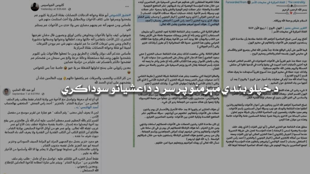 “বাগদাদী ও হাশিমীর দাসদের কলঙ্কমোচক চ্যানেল” নামক একটি গণমাধ্যম প্ল্যাটফর্ম—যা খারেজিদের বিরুদ্ধে সক্রিয়; নিজস্ব অ্যাকাউন্টে একটি টেলিগ্রাম পোস্ট প্রকাশ করেছে। পোস্টটি এমন এক দাঈশি চ্যানেলের সাথে সম্পৃক্ত, যা “উইলায়াতুশ শাম” অঞ্চলের শিবির প্রশাসনের সঙ্গে যুক্ত। সেখানে কিছু দাঈশির বিরুদ্ধে অভিযোগ আনা হয়েছে যে, তারা আল-হোল ও রোজ শিবিরের নামে অর্থ সংগ্রহ করে কিন্তু বন্দীদের কাছে তা পৌঁছে দেয় না।